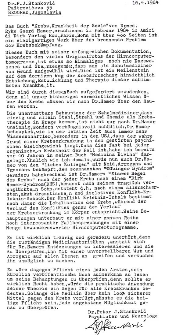 Неприкосновенные претензии ортодоксальной медицины, что только операции, облучение и химия могут применяться в качестве лечения рака, по д-ру Хамеру являются не только абсурдными, но и катастрофически вредными. Доктор Хамер утверждает, как в последнее время всё больше и больше учёных, особенно в США, что реальная причина рака лежит в нарушении психического равновесия. Что именно так обстоит дело почти с каждым органическим заболеванием, я писал в своей книге "Medicina Divina" 40 лет назад. Теперь, как и тогда со мной, борются "дорогие коллеги" с доктором Хамером завистью, высокомерием и невежеством, так называемым "синдромом Тюбингена". Практически революционным является "Железное Правило Рака" доктора Хамера, которое гласит, что любой рак возникает после "Синдрома Дирка Хамера" (DHS), названного в честь его погибшего сына, то есть после тяжелейшего, остродраматичного и изолированно пережитого конфликтного шока. Содержание конфликта определяет по Хамеру локализацию рака, а развитие конфликта в точности соответствует развитию рака в организме. В его утверждениях он опирается на целый ряд весьма интересных клинических случаев и большое количество достойных восхищения компьютерных томограмм головного мозга.