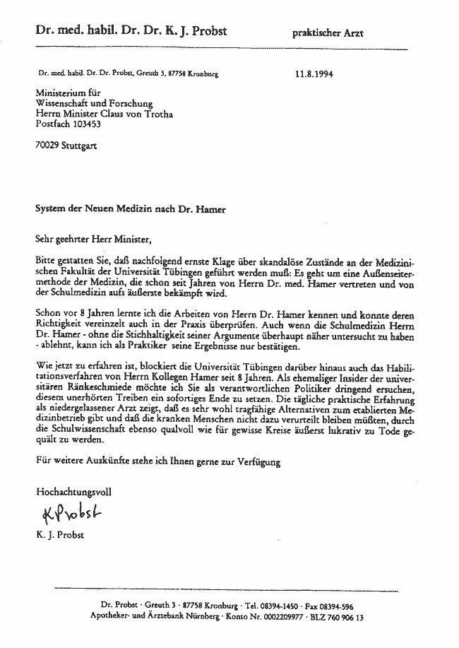 Как теперь стало известно, университет Тюбингена кроме всего прочего блокирует процесс хабилитации коллеги Хамера в течение 8 лет. Как бывший инсайдер университетской интриганской клики, я хотел бы призвать вас как ответственного политика немедленно положить конец этой возмутительной деятельности. Ежедневный практический опыт врача показывает, что жизнеспособные альтернативы этаблированной медицине очень даже существуют, и что больные люди не обязаны оставаться приговорёнными проходить через - для определённых кругов чрезвычайно прибыльные - смертельные пытки ортодоксальной медицины.