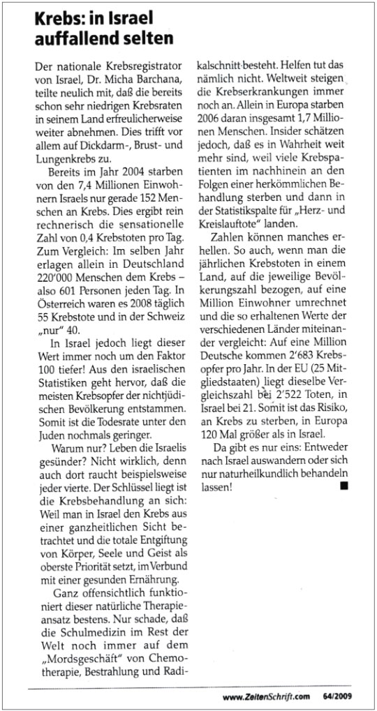 Уже в 2004 году из 7,4 миллиона жителей Израиля умерло от рака только 152 человека. Подсчитав, мы получаем сенсационную цифру – 0,4 случаев смерти от рака в день. Для сравнения: в том же году только в Германии от рака умерло 220000 человек, то есть 601 человек каждый день. В Австрии в 2008 году было 55 ежедневных случаев смерти от рака, а в Швейцарии «только» 40.