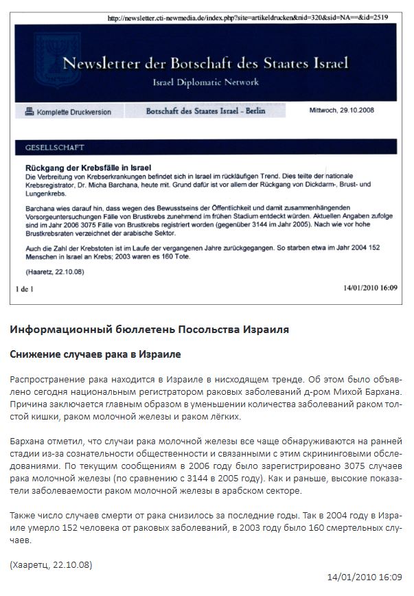 В Израиле, однако, эта цифра в 100 раз меньше. Израильские статистические данные свидетельствуют о том, что большинство жертв рака происходят из нееврейского населения. Таким образом, уровень смертности среди евреев ещё ниже.